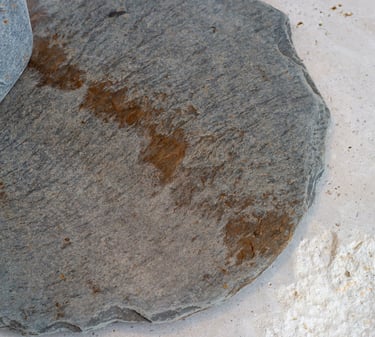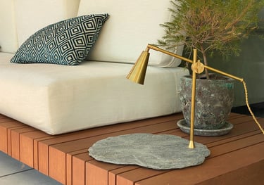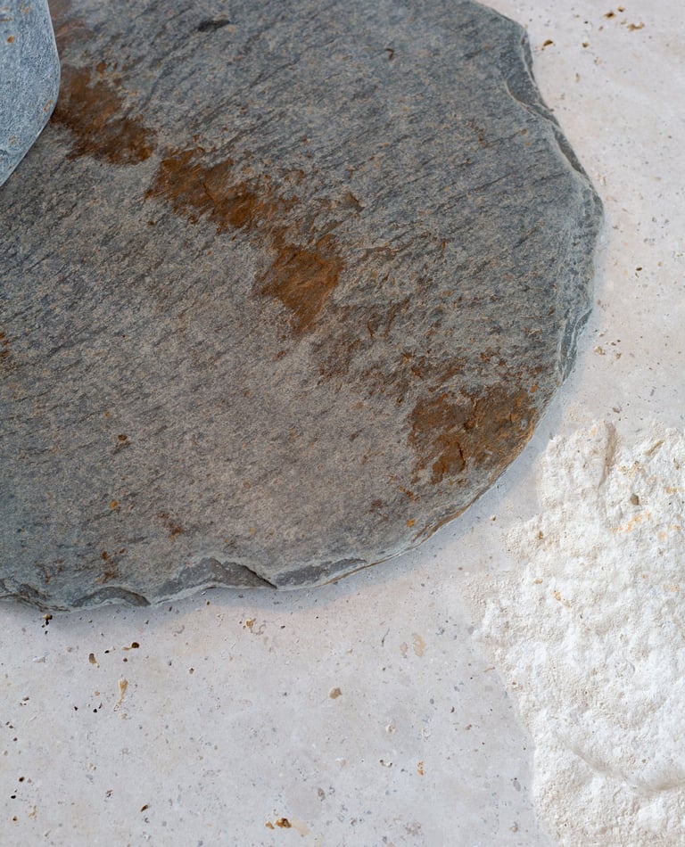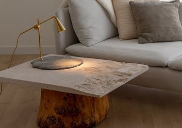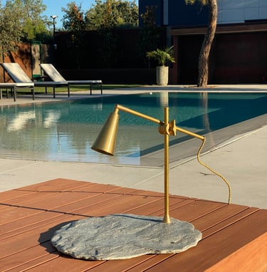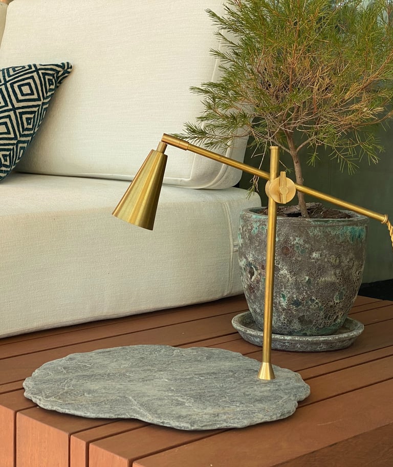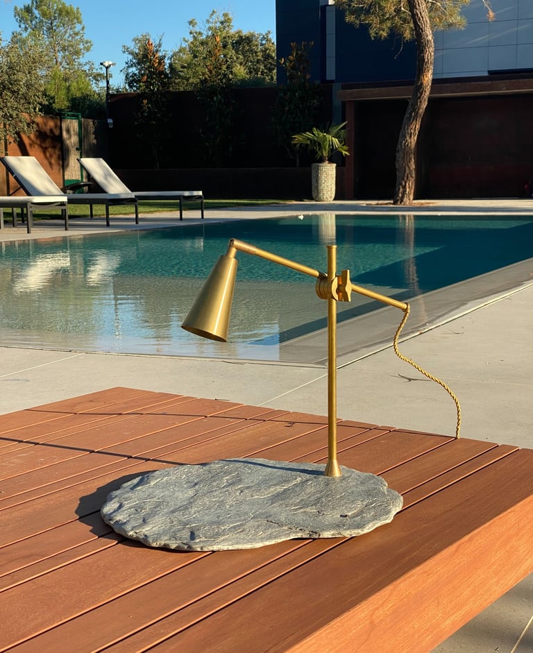 La finura de la base de pizarra negra, con sus rugosidades naturales marcadas por el tiempo, sostiene con elegancia una estructura ligera y precisa. La luz se proyecta con suavidad, reflejándose sutilmente sobre la piedra y acentuando su textura mineral.