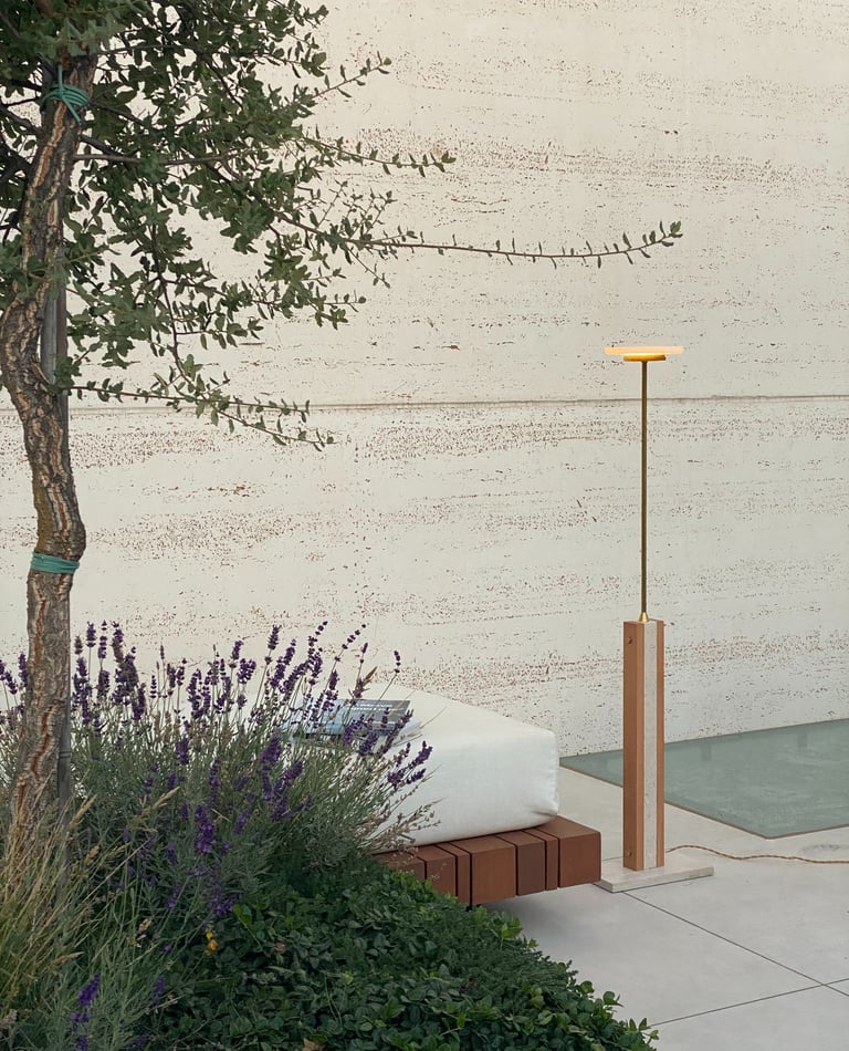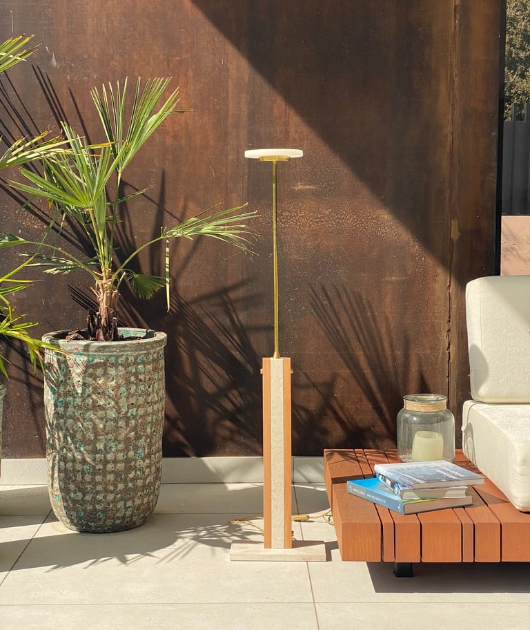 Su base en piedra de Campaspero aporta estabilidad y contraste, equilibrando la ligereza visual de la parte superior.