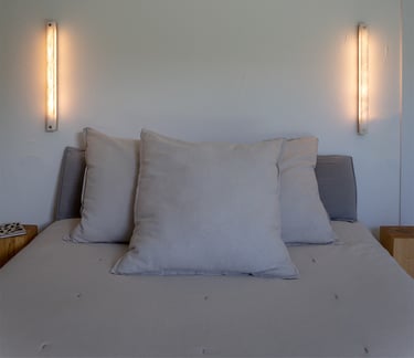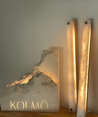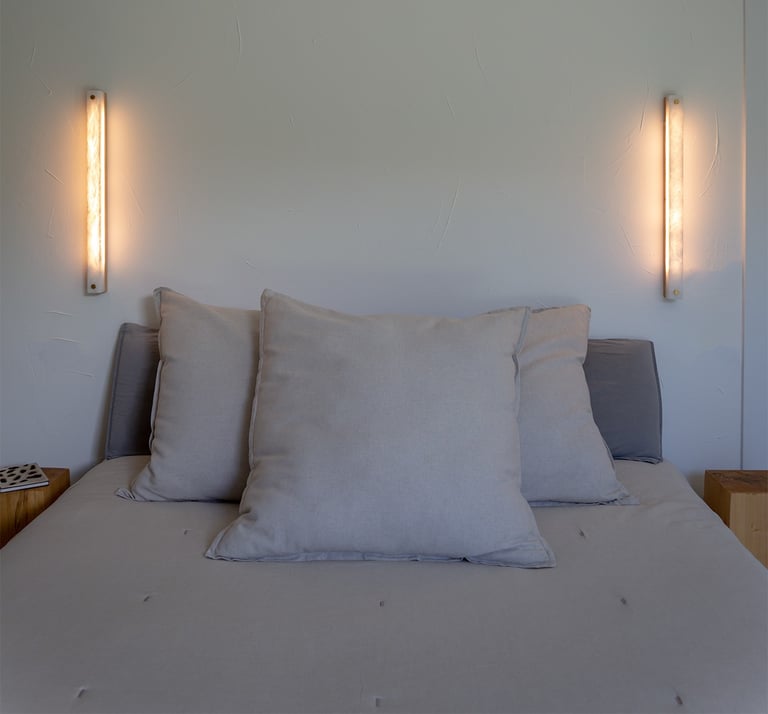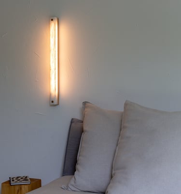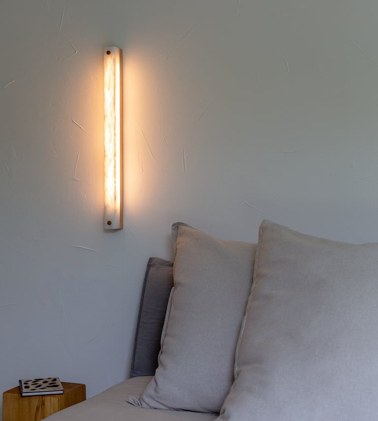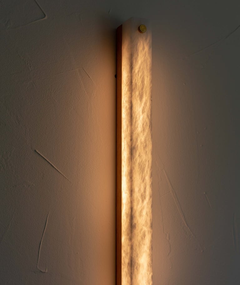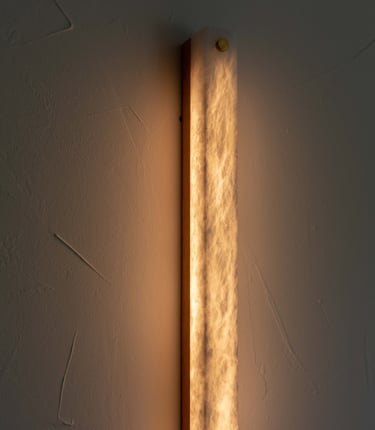 El alabastro, con su translucidez viva y sus vetas orgánicas, se convierte en pura luz. La calidez que emana de su interior transforma el muro en materia sensible, sin artificios.