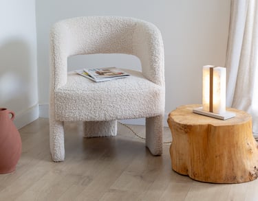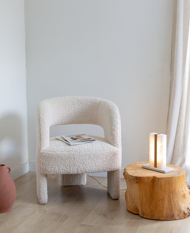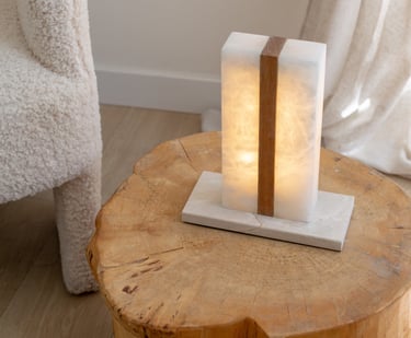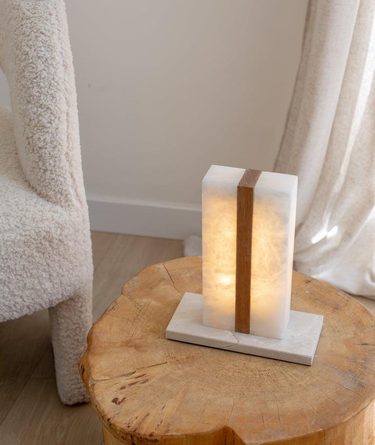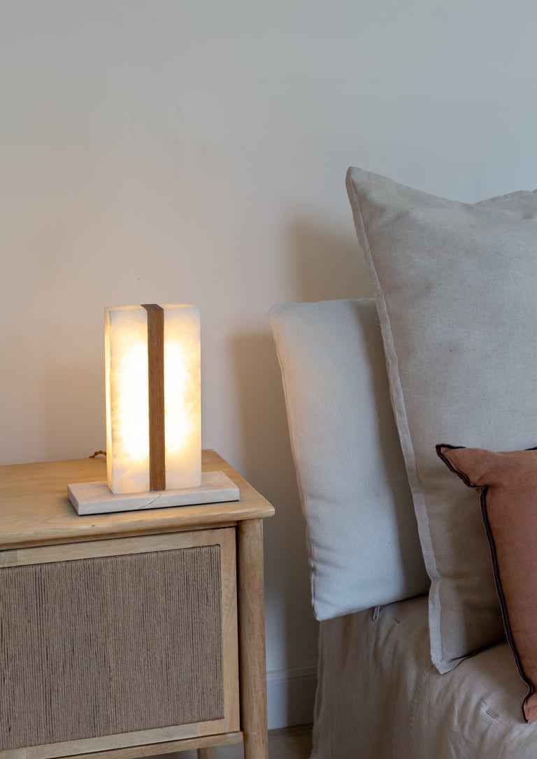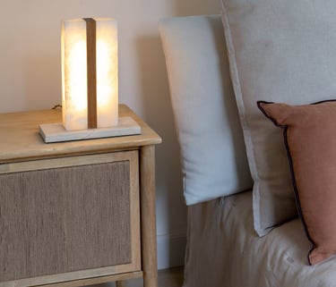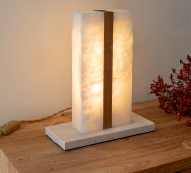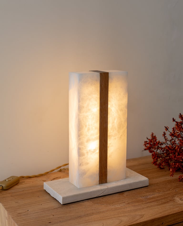 El alabastro deja pasar una luz suave que envuelve el espacio, mientras la piedra aporta peso visual y estabilidad. Ideal para atmósferas cálidas y serenas, esta lámpara de sobremesa combina materia y luz con equilibrio y sensibilidad.