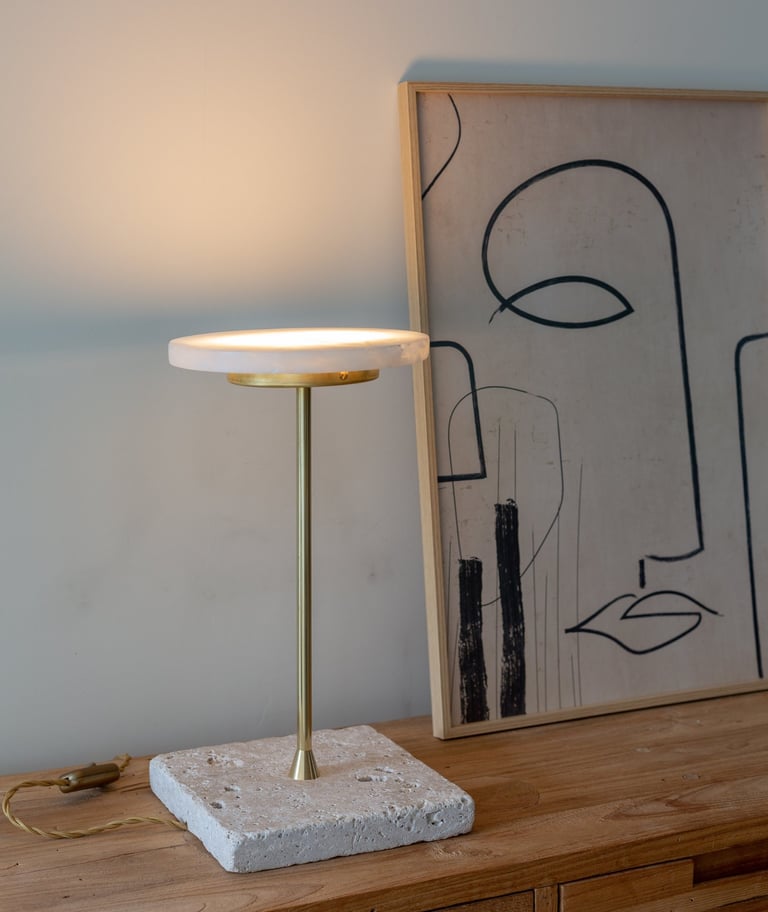 La luz emerge suavemente a través del alabastro, creando un halo cálido y envolvente, mientras la base de mármol aporta presencia y equilibrio a la composición
