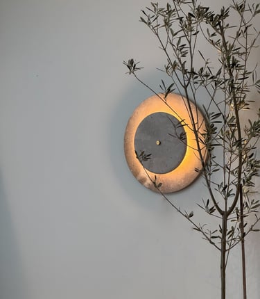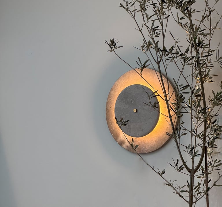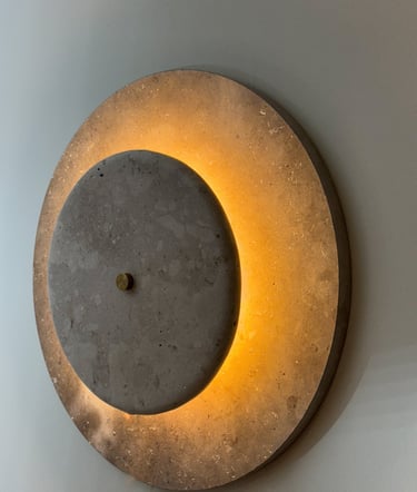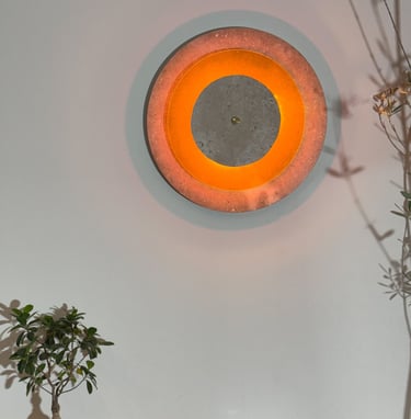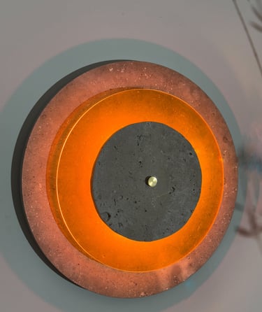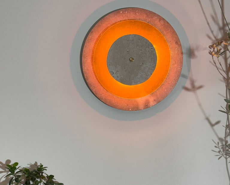 Las piezas exterior e interior en caliza de Campaspero aportan solidez mineral y textura atemporal. En el centro, un disco de metacrilato flúor —novedoso y excéntrico— irradia una luz intensa que transforma la pared en un gesto vibrante y casi hipnótico.