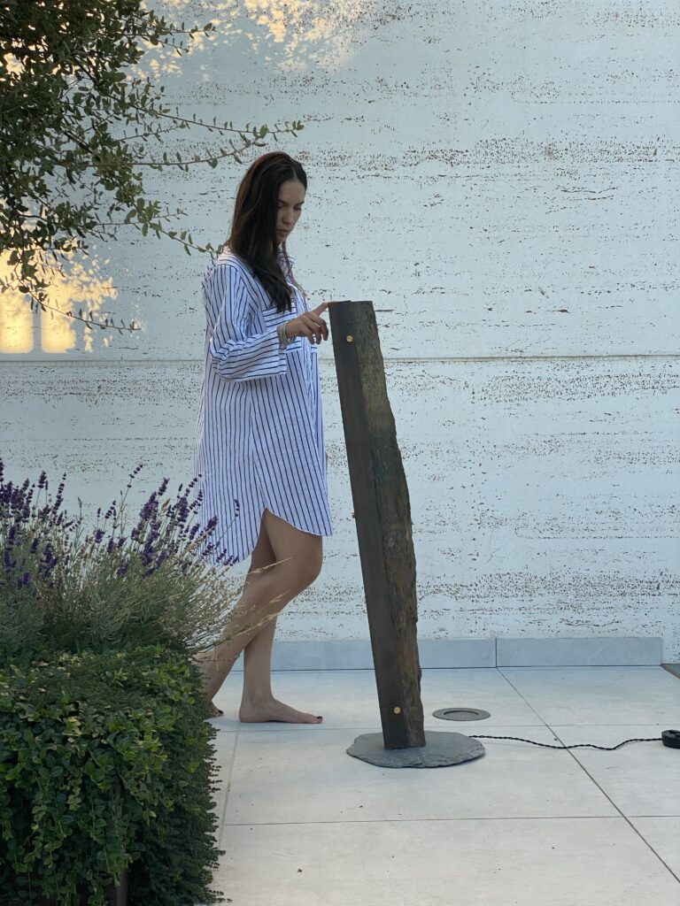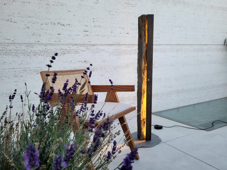 La luz cálida resbala suavemente por la superficie de filita, revelando las fracturas y vetas marcadas por el paso del tiempo. Su inclinación sutil rompe la simetría y aporta carácter, haciendo de esta lámpara una pieza única por su gesto y su materia.