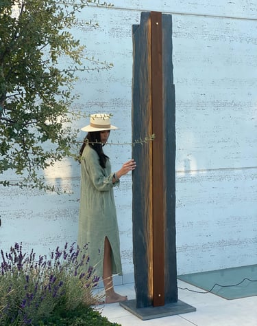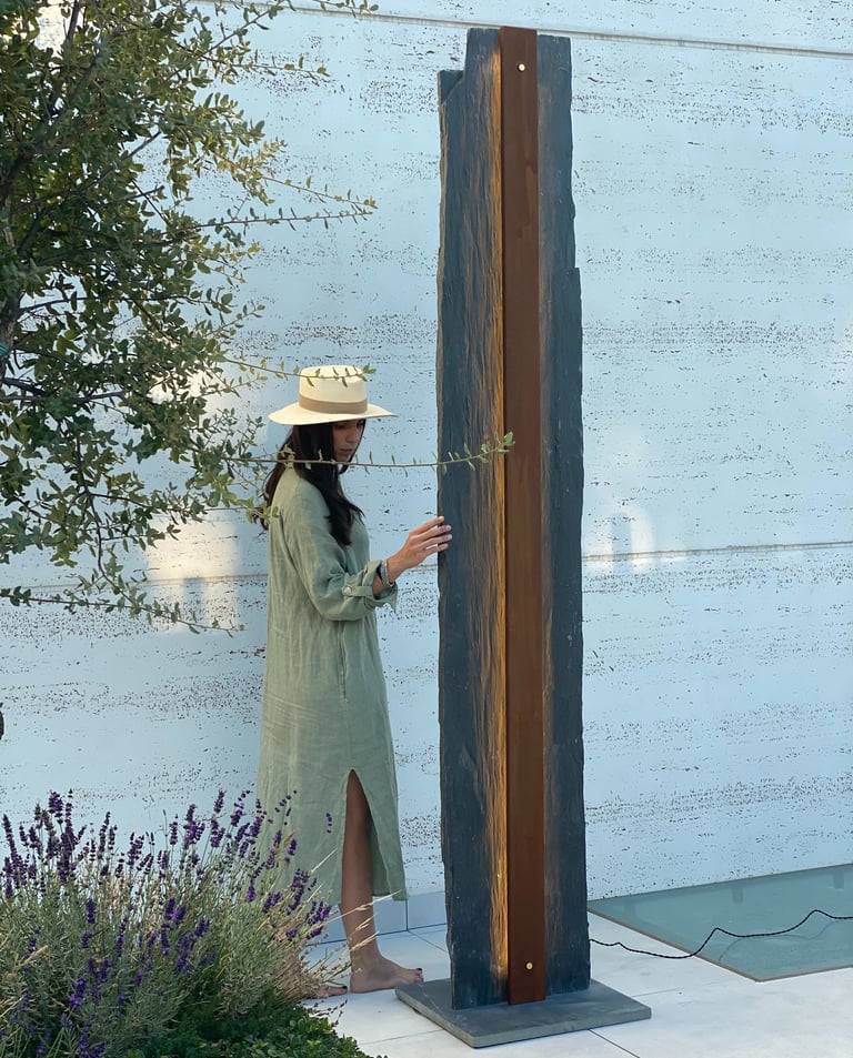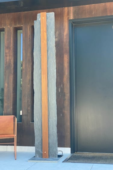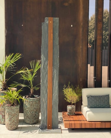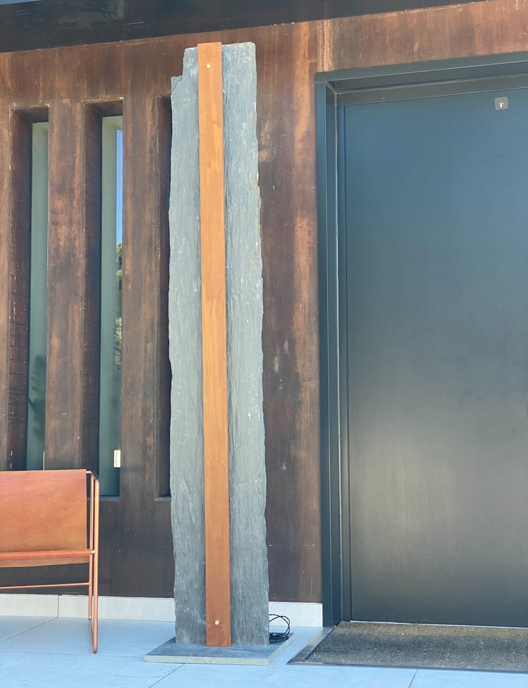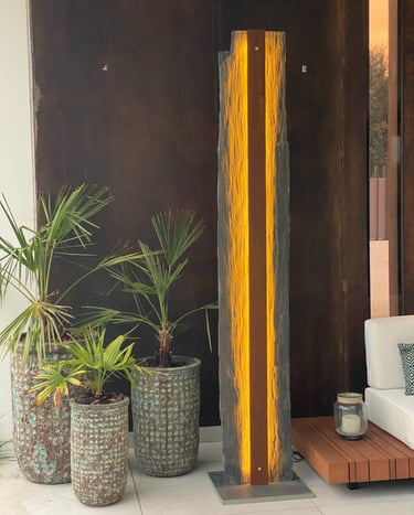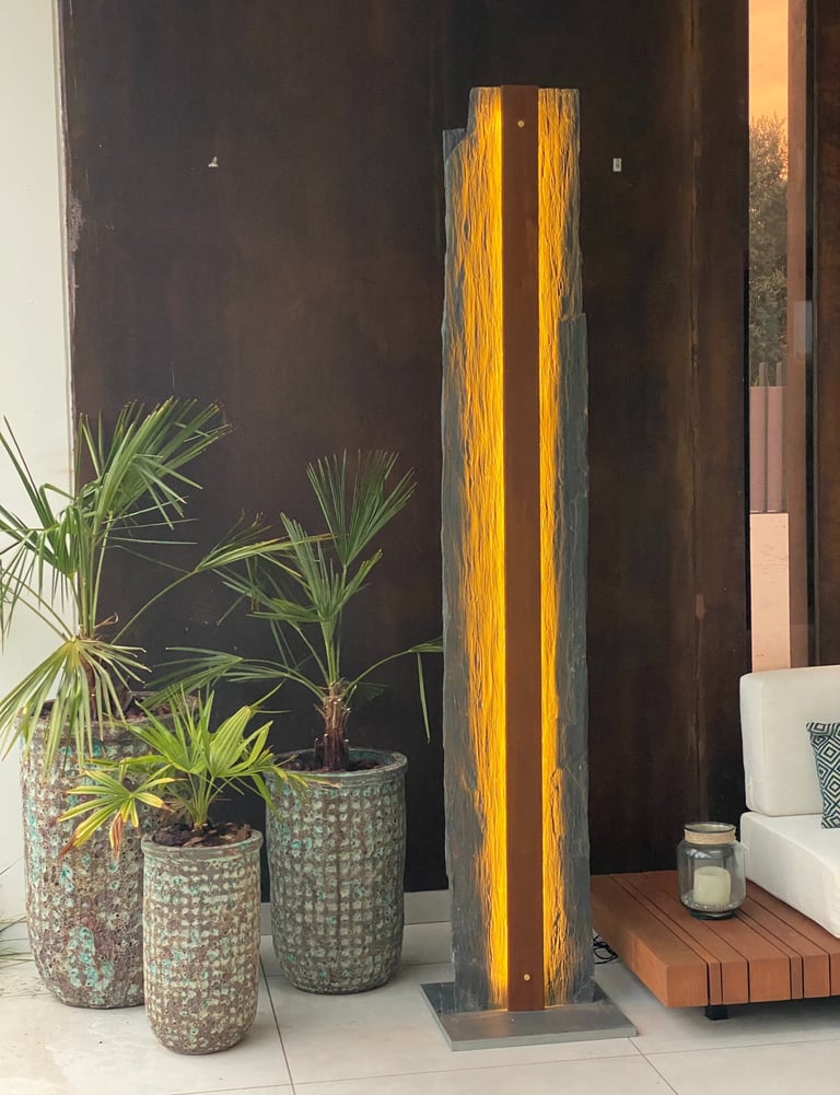 Una pieza escultórica de pizarra negra, tallada de forma natural para conservar su textura cruda y orgánica. En el centro, una franja vertical de acero corten alberga una línea de luz cálida y continua, que se esconde sutilmente y acaricia las vetas de la piedra al encenderse.